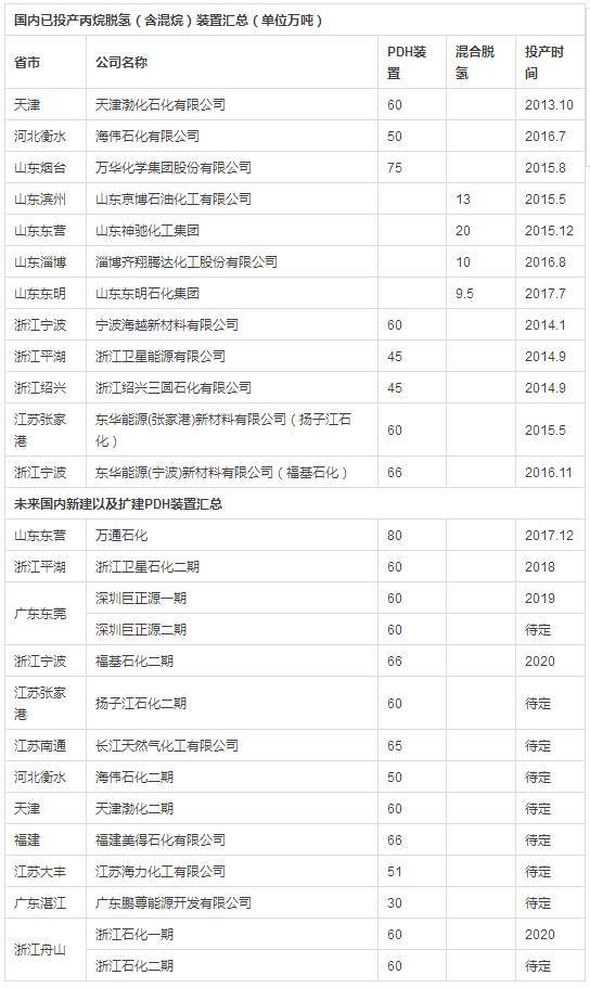 近年來,丙烷脫氫工藝在中國迅速發展,產能擴張速度驚人,逐漸成為丙烯重要來源之一。自2013年10月,隨著天津渤化60萬噸/年的丙烷脫氫裝置投產運行,丙烷脫氫裝置在國內正式拉開序幕。此后的幾年里,丙烷脫氫裝置在國內遍地開花,迅速發展,主要集中在華東的江浙地區、華北地區以及山東地區,而且近兩三年混合烷烴脫氫這種更加靈活的裝置在山東地區陸續投產運行。至今,國內丙烷脫氫(含混烷)制丙烯總產能達到513.5萬噸。但是從下表可以看出,華南地區尚無丙烷脫氫裝置,深圳巨正源丙烷脫氫裝置建成后,將填補華南地區丙烷脫氫制高性能聚丙烯及下游加工項目的空缺,給當地化工企業提供優質的化工原料。