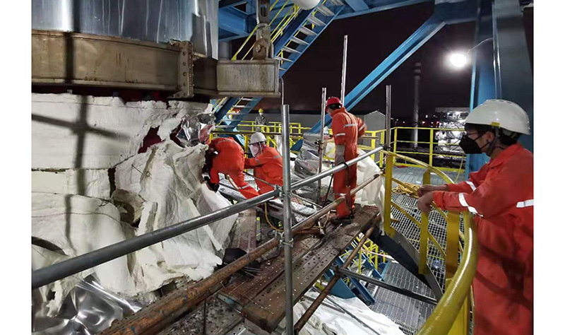 2月12日早上,丙烷脫氫裝置再生空氣進(jìn)料加熱爐錐段和直管管段焊縫開裂,裂縫長達(dá)2.5m,650℃的高溫再生空氣從裂縫漏出。公司高度重視,立即啟動(dòng)緊急預(yù)案,特護(hù)運(yùn)行,討論堵漏方案,落實(shí)特殊作業(yè)施工隊(duì)伍,按照政府及公司規(guī)定完成入廠教育及疫情期間人員備案,嚴(yán)防死守做好防疫工作,組織高溫堵漏隊(duì)伍進(jìn)場。
