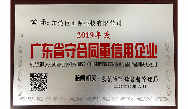 近日,經東莞市市場監督管理局審核批準,東莞巨正源科技有限公司獲得2019年度“廣東省守合同重信用企業”榮譽稱號。