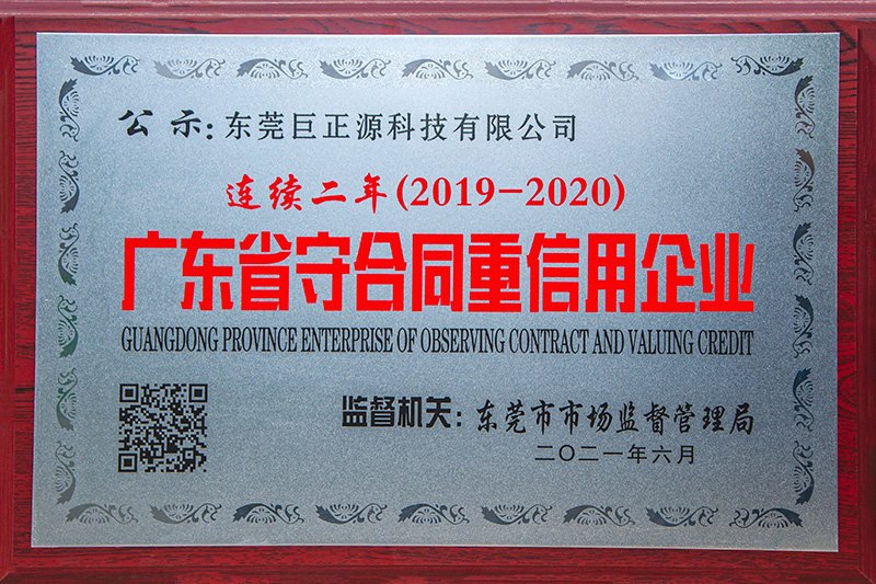 日前,廣東省市場監督管理局公布了2020年度“廣東省守合同重信用企業”公示名單,東莞巨正源科技有限公司連續二年(2019-2020年)榮獲“廣東省守合同重信用企業”榮譽稱號。