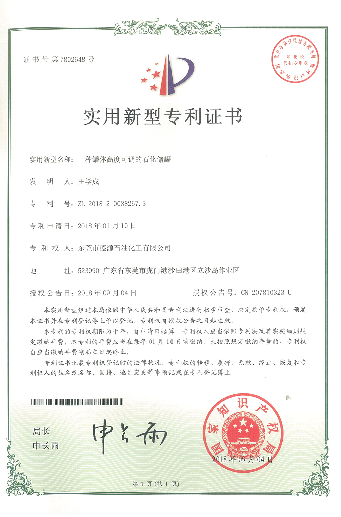 實(shí)用新型可調(diào)儲(chǔ)罐專利證書